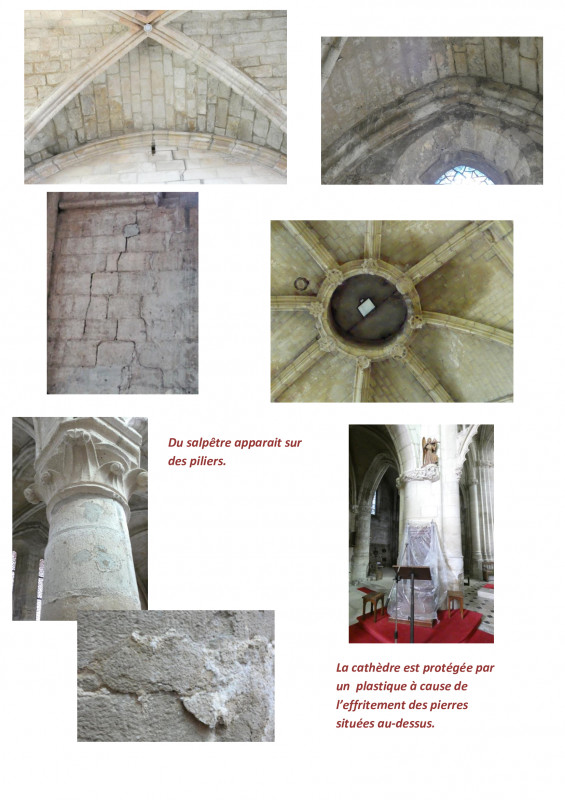 Les murs se fissurent, les pierres s’effritent partout, les sculptures disparaissent. Le porche sud est dans un état catastrophique, d’ailleurs fermé par sécurité.Les pigeons nichés dans le clocher font des ravages intérieurs.